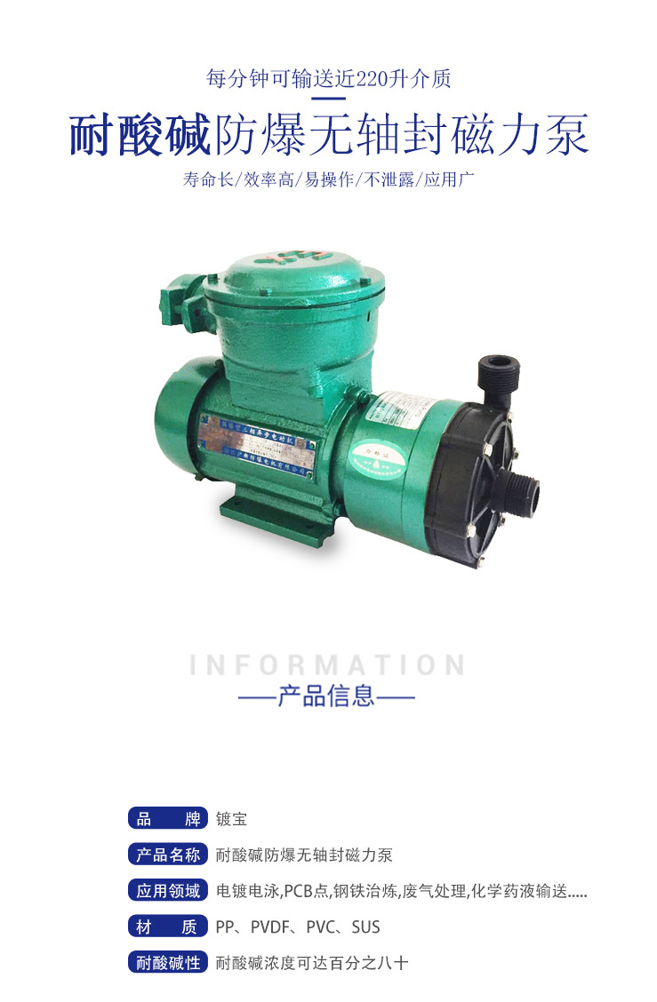 防爆磁力泵因為有著獨特的設計擁有防爆裝置,即使輸送的液體帶有易燃易爆性質,也不會產(chǎn)生爆炸。