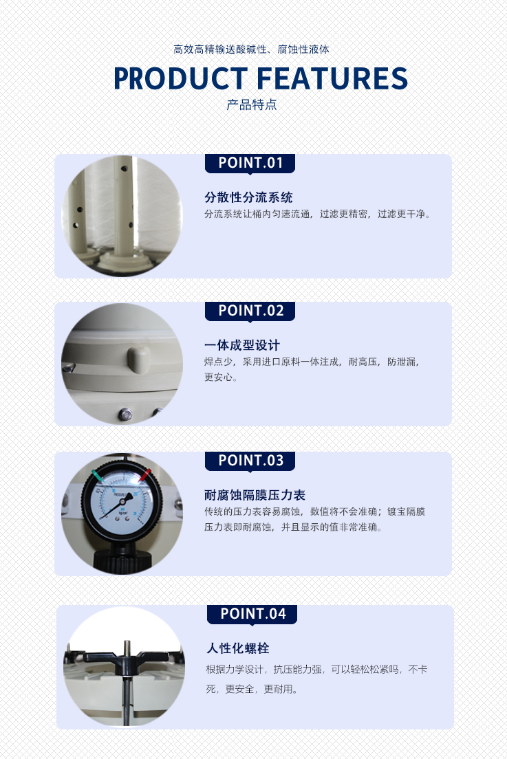 4、過濾機(jī)主體與底座采用PP材料一-體射出成型,焊接點(diǎn)Z少具耐高溫、耐酸堿等特點(diǎn)。