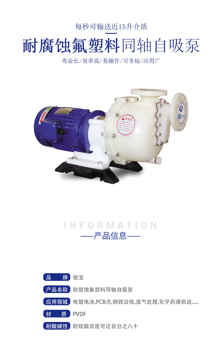 鍍寶氟塑料自吸泵   功能特點(diǎn):   1、獨(dú)特的軸封設(shè)計(jì),采用制冷式設(shè)計(jì),無(wú)須外加冷卻。   2、葉輪采用一體成型,壽命長(zhǎng),效率高。   3、化學(xué)液體,循環(huán)或輸送制程,電鍍、化工、皮革、 染整、廢...